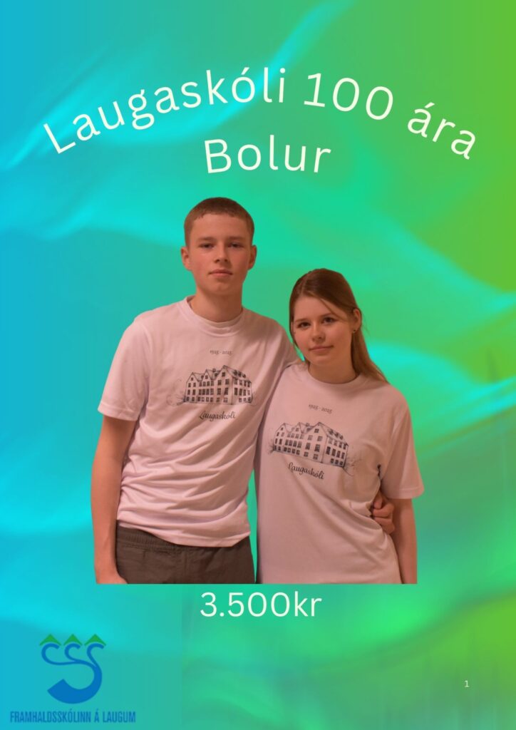 Vegna fjölda fyrirspurna um Laugaskólabolina, sem starfsfólk og nemendur klæddust á 100 ára afmæli skólans, höfum við ákveðið að láta framleiða fleiri boli og bjóða velunnurum skólans til kaups. Bolirnir eru í stærðum XS-S-M-L-XL-XXL og barnabolir í stærðum 3-4 ára, 5-6 ára, 7-8 ára, 9-11 ára og 12-13 ára. Bolirnir eru úr íþróttaefni og halda sér vel í þvotti. Verð:3500.-