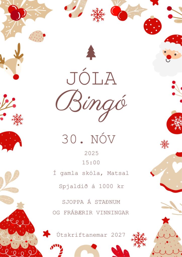 Jólabingó Posted on 26. nóvember, 2025 by Ritari Framhaldsskólans á Laugum Birt 26. nóvember, 2025 Deila