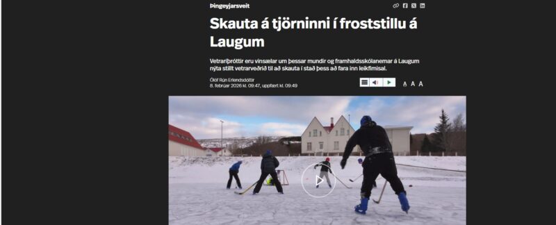 Frétt á Rúv um nemendur Framhaldsskólans á Laugum Posted on 9. febrúar, 2026 by Ritari Framhaldsskólans á Laugum Birt 9. febrúar, 2026 Skemmtileg frétt var tekin upp á Tjörninni í seinustu viku sem hægt er að skoða með því að smella á hlekkinn hér fyrir neðan. Skauta á tjörninni í froststillu á Laugum – RÚV.is Deila