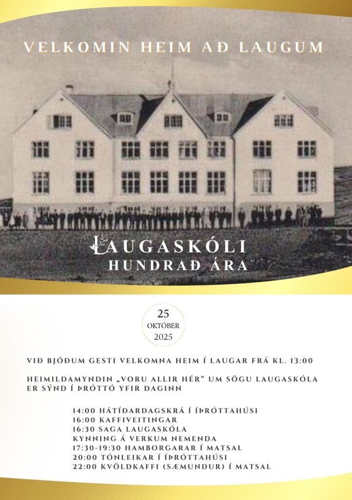 Laugaskóli 100 ára – boð í afmæli Posted on 29. september, 2025 by Ritari Framhaldsskólans á Laugum Birt 29. september, 2025 Deila