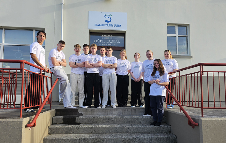 Nemendur Laugaskóla klæddust nýjum bolum sem pantaðir voru í tilefni af hundrað ára afmæli skólans